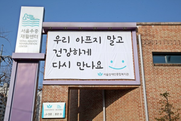 서울특별시의 긴급 휴관 요청에 따라 임시 휴관 중인 복지관이 옥외 게시판으로 인사 나눕니다.