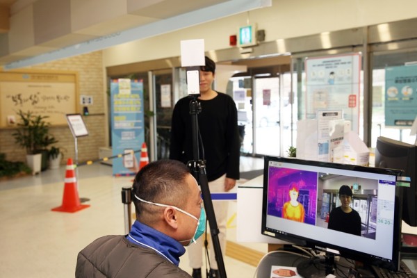 다시 얼굴을 맞대고 인사할 수 있을 때까지 입구에서 사람들을 맞이하고 있는 열화상 카메라