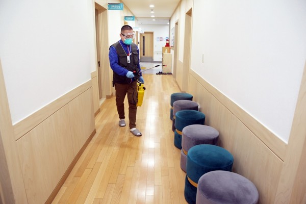 사람들 손이 자주 닿는 손잡이, 교구 등은 물론 매일 복지관 곳곳을 방역 소독하는 중