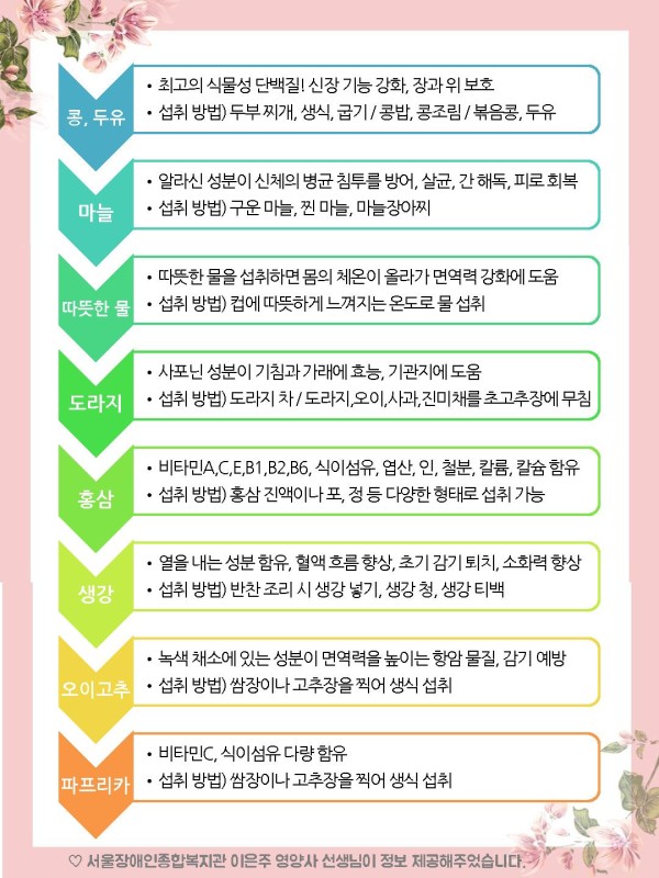 이렇게 ‘일상에서 손쉽게 접할 수 있는 면역력 높이는 봄철 음식’ 안내지가 만들어졌습니다.