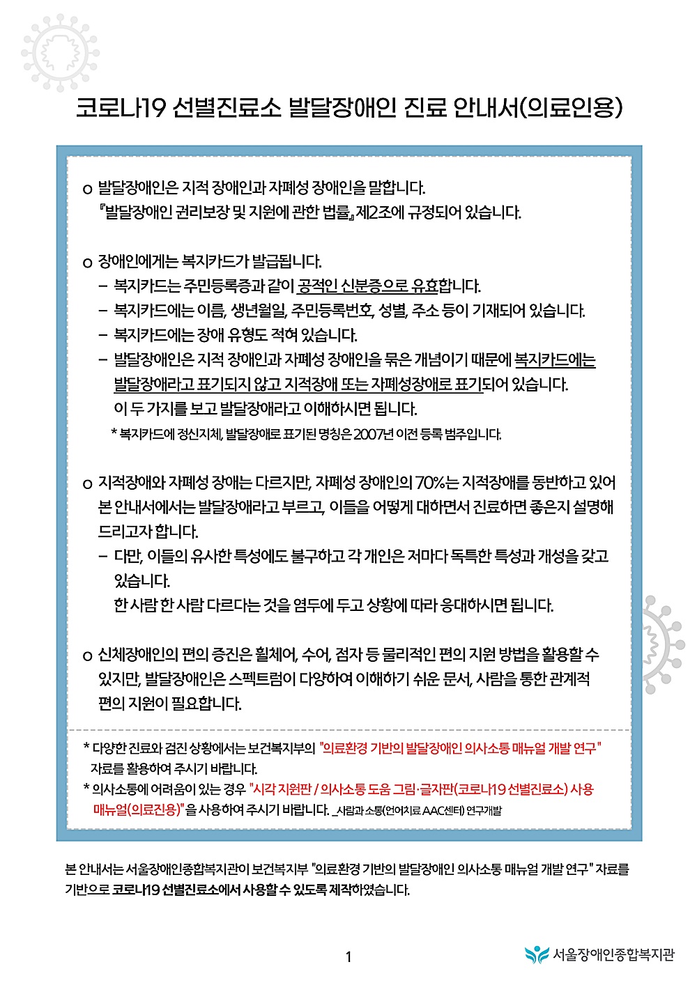 - <코로나19 선별진료소 발달장애인 진료 안내서(의료인용)_서울장애인종합복지관 제작>