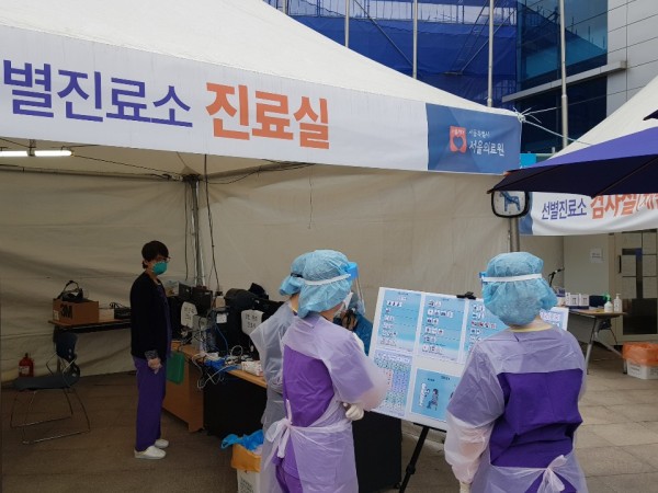 며칠 뒤, 서울의료원에서 사진이 왔습니다. 선별진료소의 직원 대상으로 교육을 하는 사진이었습니다.