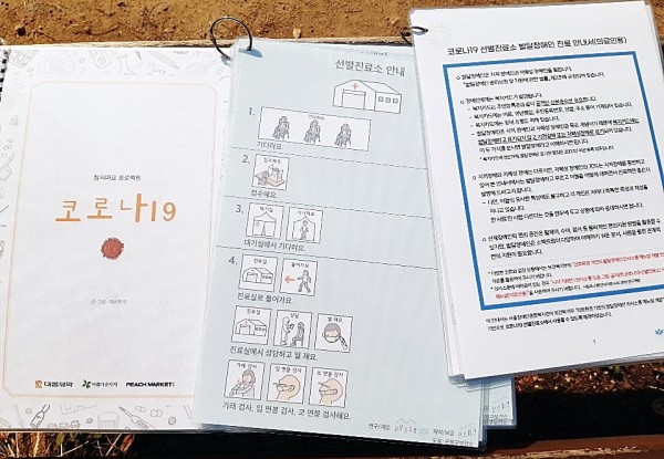 대웅제약이 ‘참지마요 프로젝트’를 통해 배포하고 있는 <코로나19 쉬운 글 도서>, 언어치료 AAC센터 ‘사람과 소통’이 연구 개발한 <시각 지원판/의사소통 도움 그림·글자판(코로나19 선별진료소) 사용매뉴얼(의료진용)>도 코로나19 선별진료소 의료진들이 읽기 쉽도록 출력하고 코팅하고 엮어서 함께 전달했습니다.