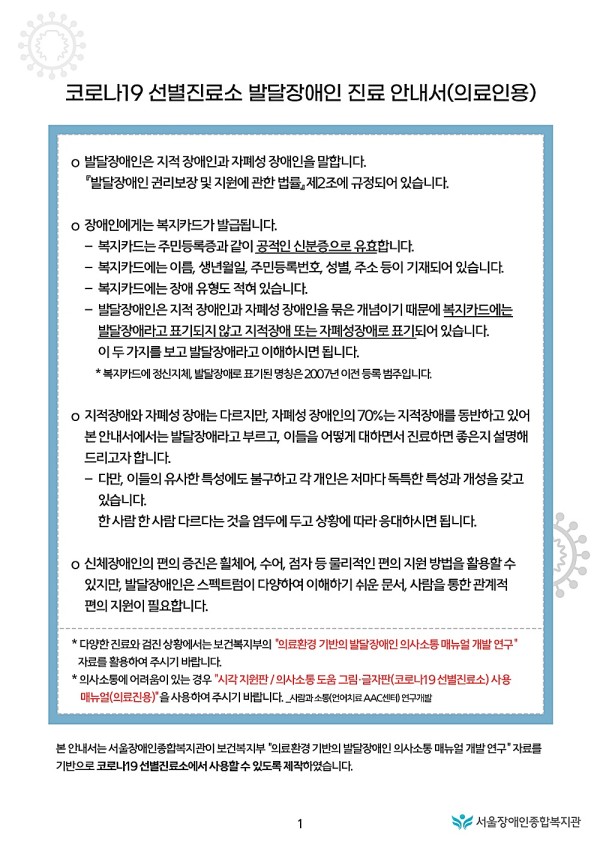서울장애인종합복지관 사람중심서비스국에서도 발달장애인 환자와 의료진을 위한 <코로나19 선별진료소 발달장애인 진료 안내서(의료인용)>를 제작했습니다.