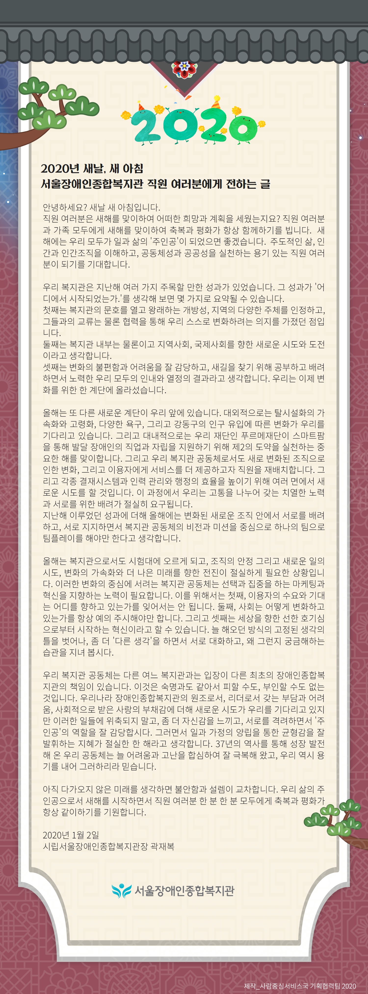 새해 첫 업무를 알린 2020년 시무식. 새해를 맞이하여 곽재복 서울장애인종합복지관장이 직원에게는 전한 글입니다.