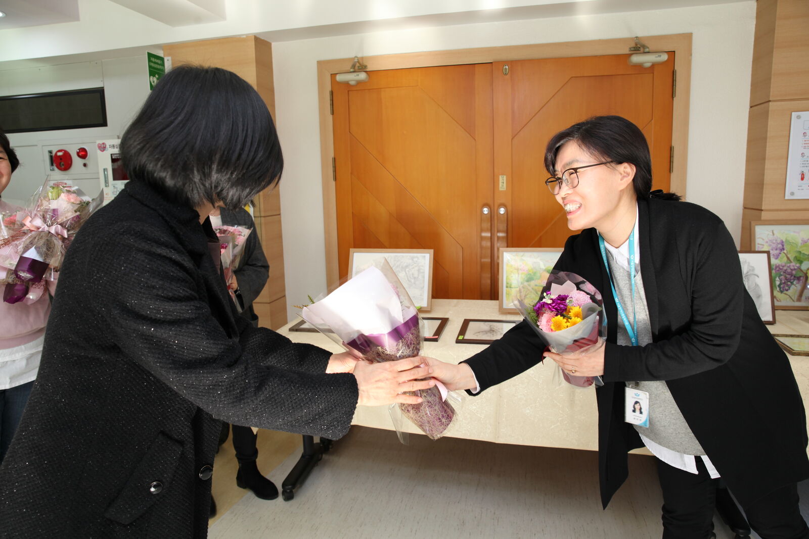 전시회 첫날, 최미영 운영지원실장이 축하의 꽃다발을 전했습니다.