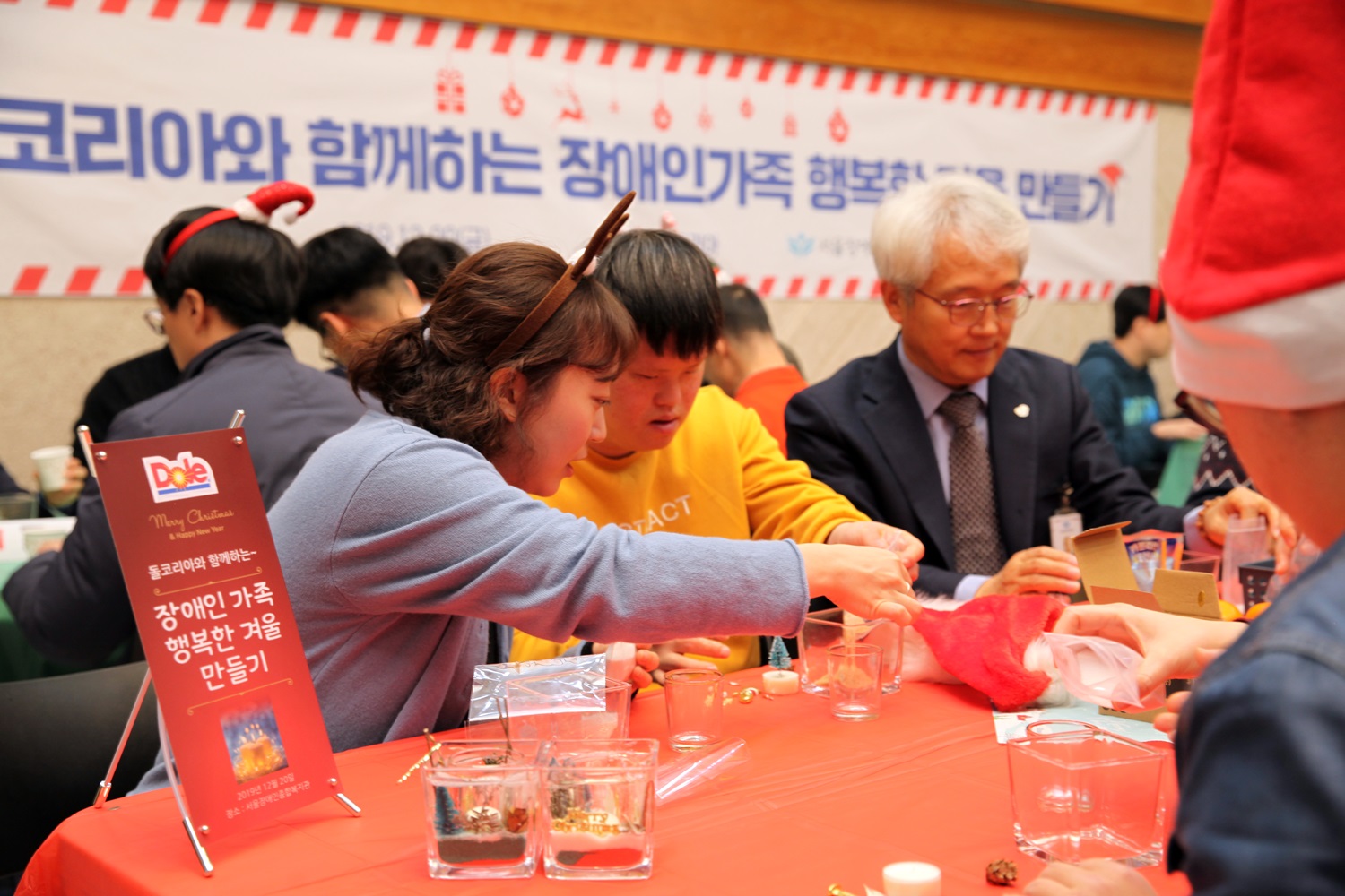 이번 ‘장애인 가족 행복한 겨울 만들기’ 행사에는 우리 복지관 직업적응훈련생, 성인발달장애인 낮활동 프로그램 ‘푸르메아카데미’ 이용자와 돌(Dole)코리아 직원 100여 명이 함께했으며, 총 12개 조로 팀을 이루어 다가오는 크리스마스에 어울리는 캔들 홀더를 제작하는 시간을 가졌습니다.