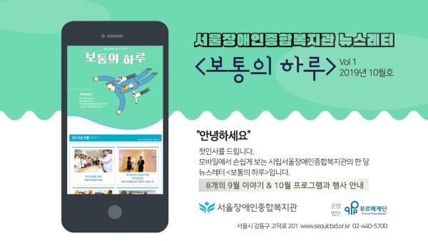시립서울장애인종합복지관은 홈페이지 개편과 모바일 환경에 맞추어 스마트폰으로 보다 쉽게 복지관이 지내온 한 달과 앞으로의 한 달을 보실 수 있도록 뉴스레터 '보통의 하루'를 제작하게 되었습니다. 소식과 홍보를 넘어서 사람들과 함께한 복지관 기록물로 만들겠습니다.
