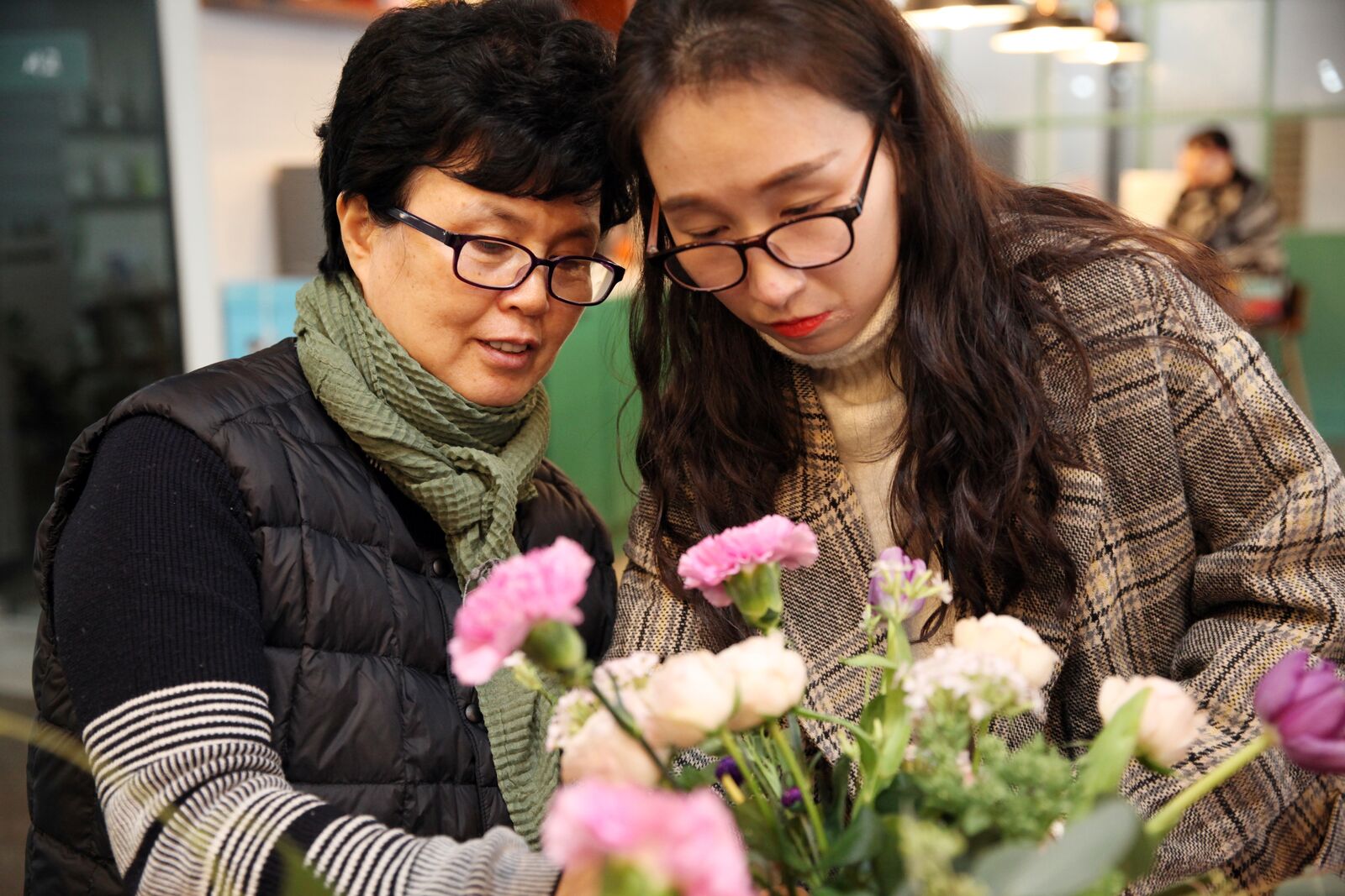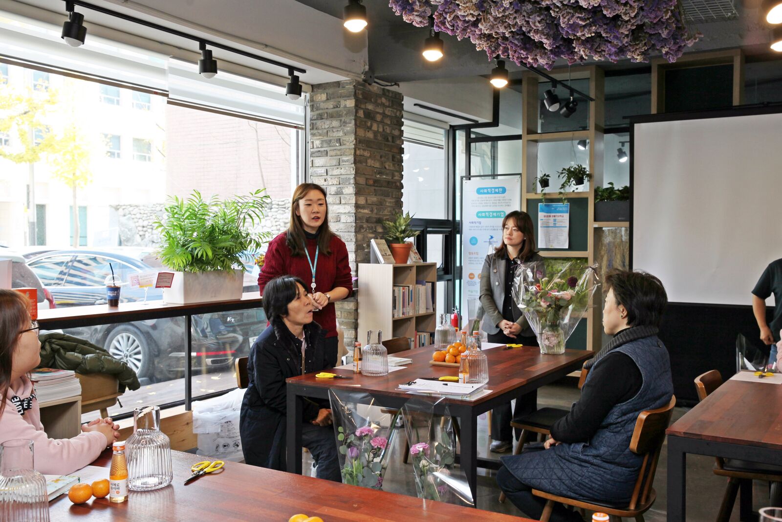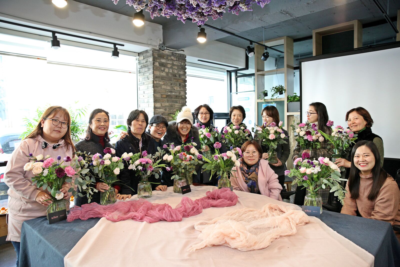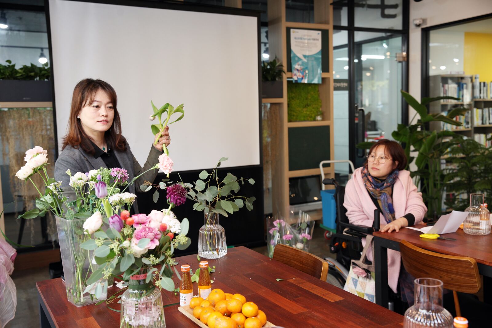 11월 19일(화), 강동사회적경제지원센터에서 꽃꽂이 프로그램이 열린 가운데, 활짝 핀 꽃 만큼이나 사람들 표정도 활짝 피었습니다.
