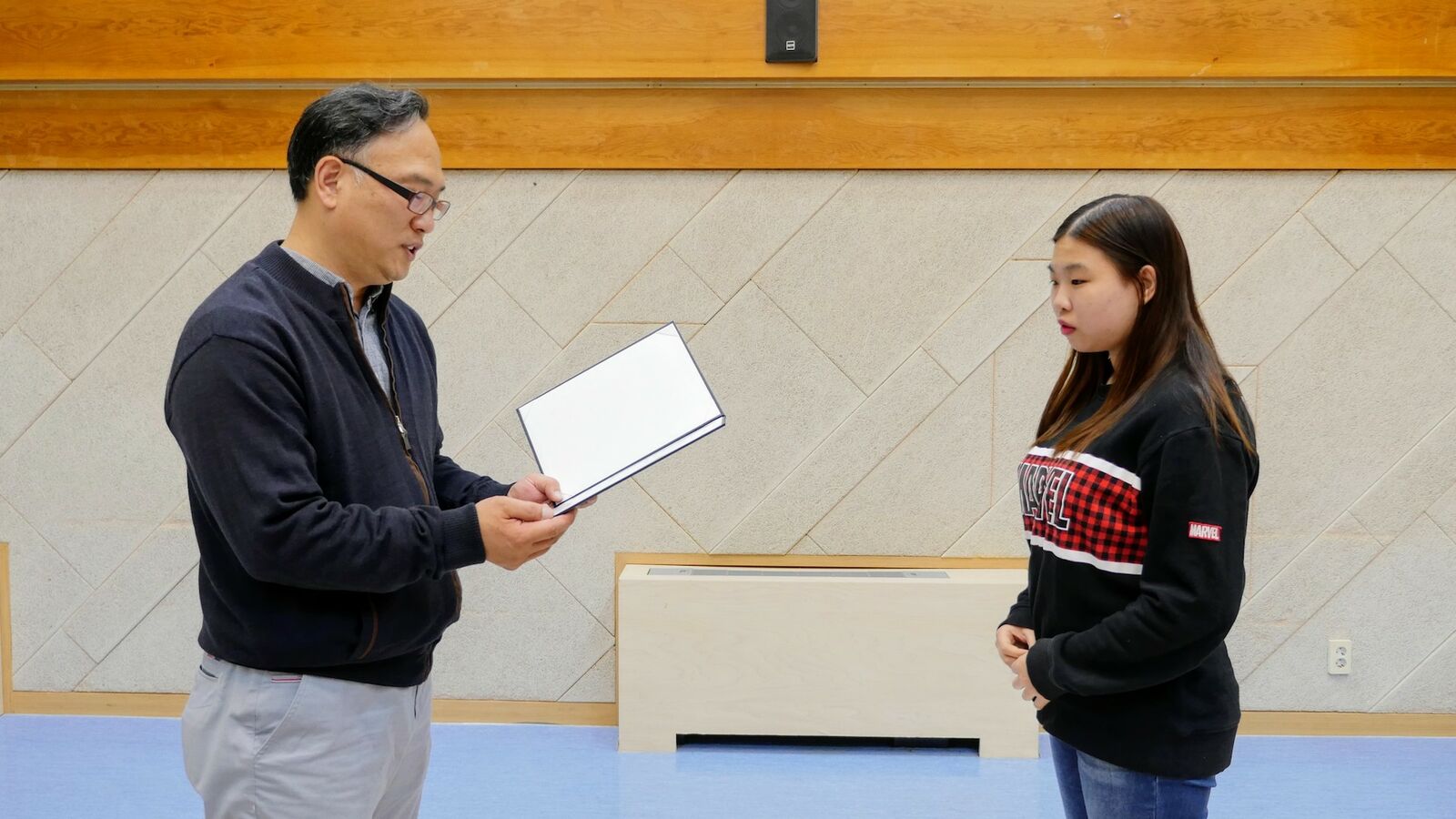 새롭게 위원이 된 임지연 직업적응훈련생은 오늘 회의 참석을 위해 실습 시간을 조정하여 다른 위원들의 박수를 받았습니다.