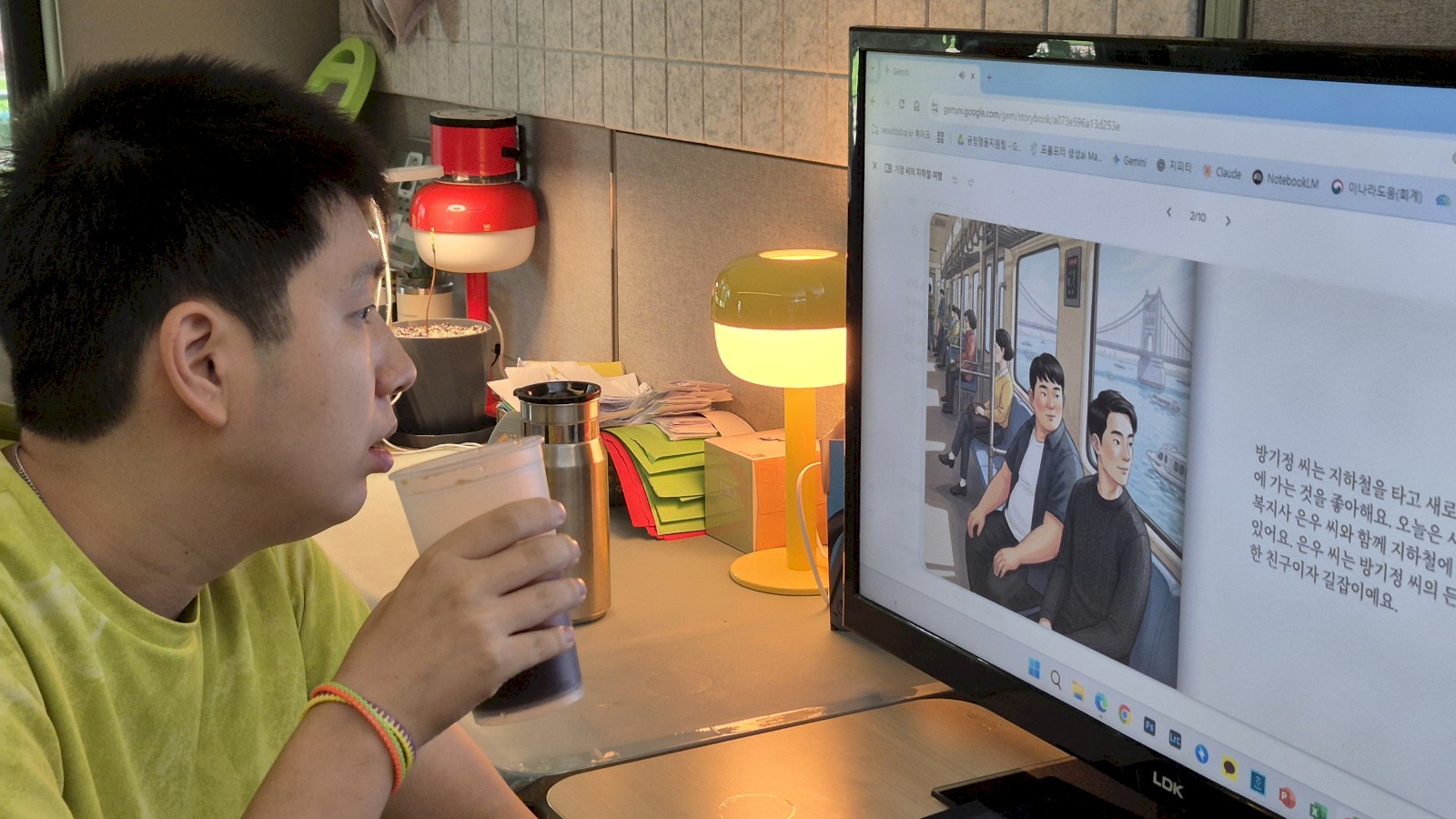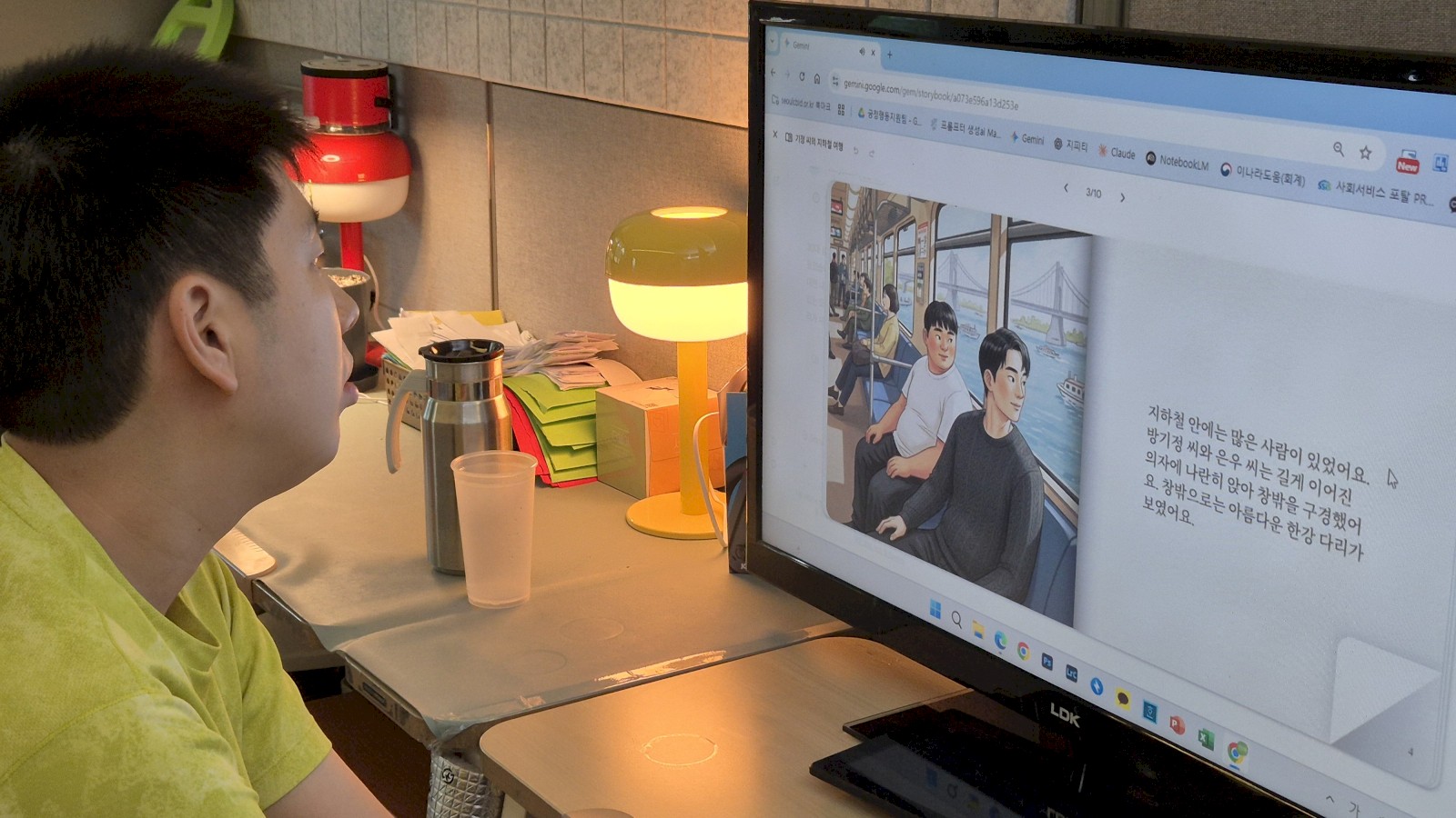 (사진 : 구글 제미나이 ‘스토리북’ 기능을 활용한 '사회적 이야기' 자료를 보는 방기정 님)