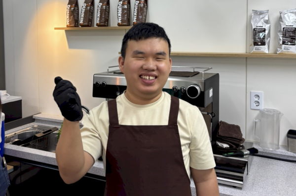 행사 시작 전부터 카운터 앞에는 주문을 기다리는 손님들의 줄이 길게 이어졌습니다. ‘광복절 빛을 되찾은 날’이라고 적힌 현수막이 카운터 앞을 장식했고, 점장으로 변신한 직업적응훈련생 4명은 주문을 받고, 결제를 하고, 에스프레소 머신을 능숙하게 다루었습니다.