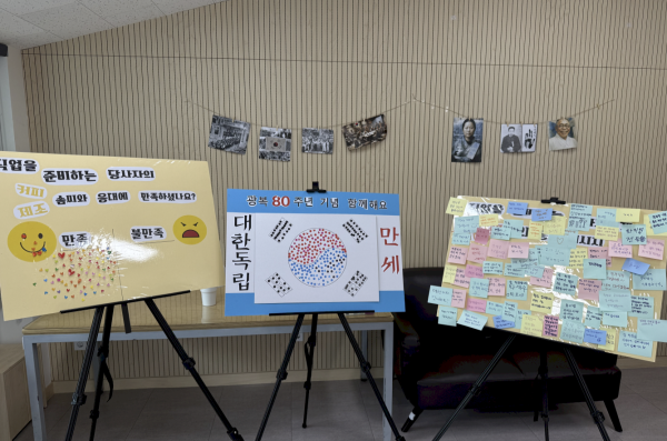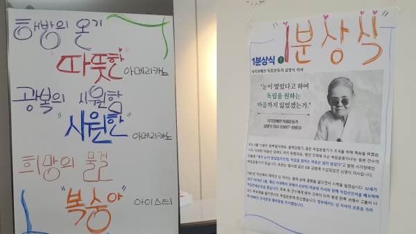전시 옆에는 ‘대한독립 만세’가 적힌 태극기 보드와 손님들이 작성한 응원 메시지가 빼곡히 붙어, 행사장의 분위기를 더욱 특별하게 만들었습니다.