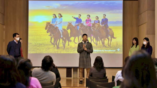 이번 순서에서는 운영지원팀이 구글 나노바나나(AI 툴)로 제작한 말띠 직원들이 붉은 말을 타고 달리는 배경을 사용하여 시무식 분위기를 유쾌하게 돋웠습니다.
