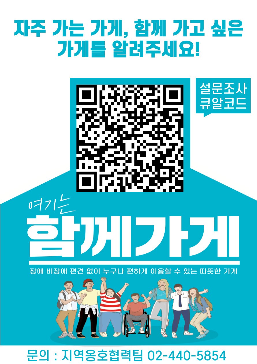 2025 함께가게 설문 페이지 정보 작성자 서울장애인종합복지관 작성일25-04-10 17:43 조회수181 본문 ▲ 2025년 함께가게 설문 홍보 포스터 평소 자주 가는 가게, 가보고 싶었던 가게를 알려주세요! 함께가게란? 장애인과 비장애인 모두가 편안하게 이용할 수 있는 지역 상점을 발굴하고 지원합니다! 장애 당사자가 일상생활 속에서 느끼는 물리적·심리적 장벽을 낮추어 행복한 일상을 누릴 수 있도록 강동구 내 지역 상점(카페, 식당, 미용실 등)에게 장애에 대한 긍정적인 메시지를 전달하고, 장애인의 보편적 권리를 알립니다. 설문 참여 방법 : 큐알코드 혹은 링크 참고 문의 : 지역포괄촉진부 지역옹호협력팀 02-440-5854 관련링크 https://docs.google.com/forms/d/1VHkSzSoY93OVqlO23MVKXuCznvu2LyQWFu361… 목록 이전글 장애인의 날 '같이의 가치' 오늘은 내가 점장 (일일카페) 안내 드립니다. 25.04.11 다음글 2025년 3월 업무추진비 집행내역 공개 25.04.02