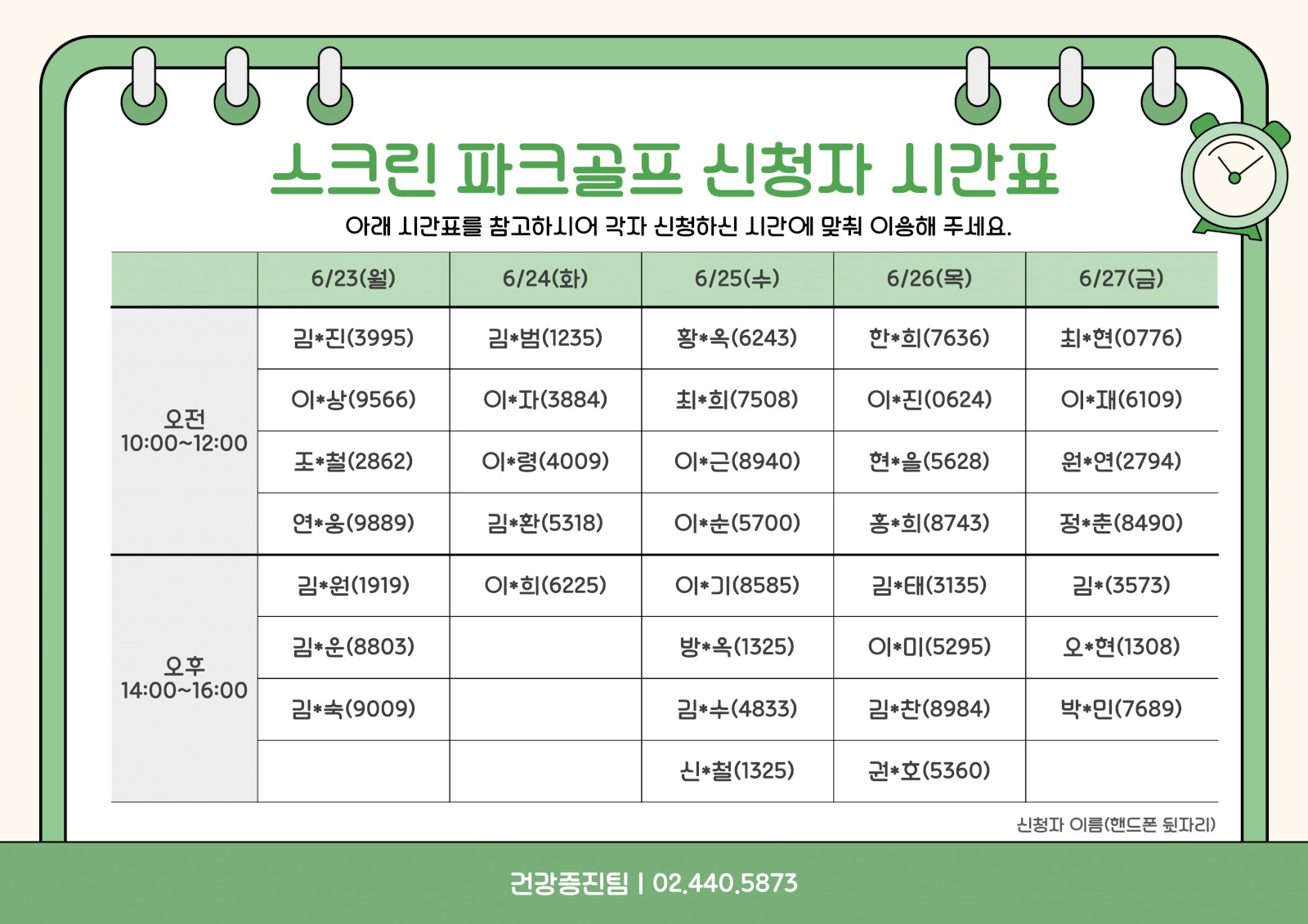 스크린 파크골프 시간표 안내 페이지 정보 작성자 서울장애인종합복지관 작성일25-06-20 16:43 조회수162 본문 안녕하세요 서울장애인종합복지관 건강증진팀입니다.아래와 같이 스크린 파크골프 시간표를 안내드립니다.신청하신 분들은 해당 시간에 맞춰 이용해 주세요.운영시간 : 오전 10:00~12:00 / 오후 14:00~16:00장소 : 서울장애인종합복지관 지하 1층 스크린 파크골프장문의 : 건강증진팀 장호경 02-440-5873 목록 이전글 강동구 보건소와 함께하는 '찾아가는 마음건강' 심리상담 참여자 모집 (2번째) 25.06.25 다음글 열린교육 누구나배움터 <아로마테라피> 참여자 추첨 안내 25.06.19
