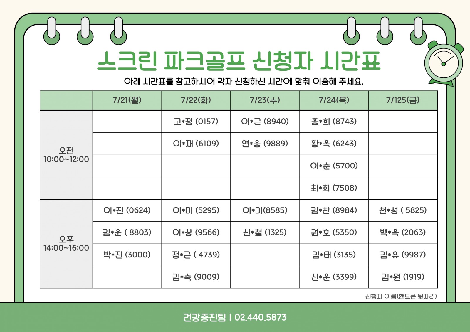 스크린 파크골프 시간표 안내 (7/21~7/25) 페이지 정보 작성자 서울장애인종합복지관 작성일25-07-18 16:22 조회수110 본문 안녕하세요 서울장애인종합복지관 건강증진팀입니다.아래와 같이 스크린 파크골프 시간표를 안내드립니다.신청하신 분들은 해당 시간에 맞춰 이용해 주세요.운영시간 : 오전 10:00~12:00 / 오후 14:00~16:00장소 : 서울장애인종합복지관 지하 1층 스크린 파크골프장문의 : 건강증진팀 장호경 02-440-5873 목록 이전글 "발달장애인을 위한 음악교육 전문가 교육 실시" 참여자 모집 25.07.23 다음글 스크린 파크골프 시간표 안내 (7/14~7/18) 25.07.11