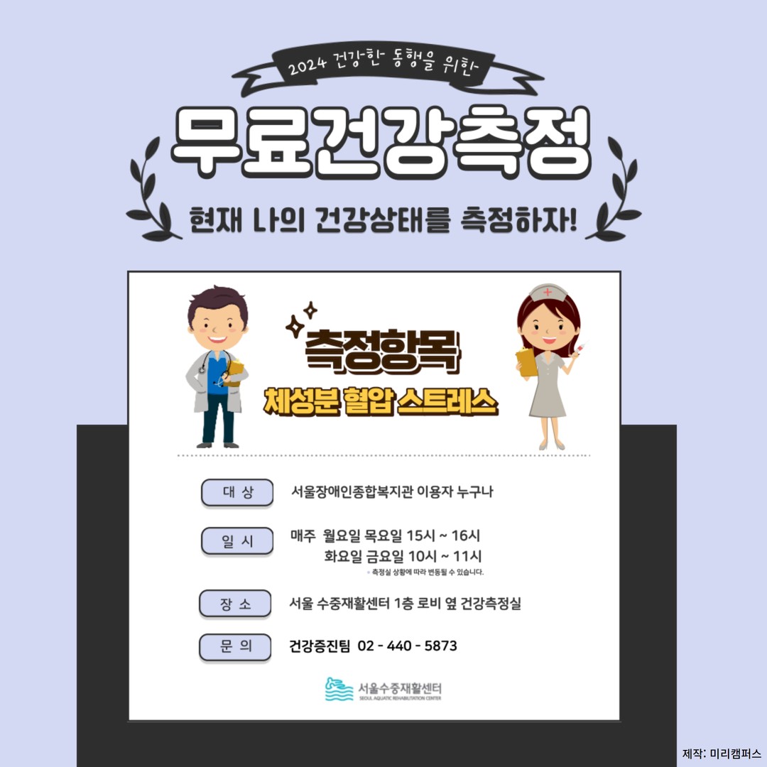 "현재 나의 건강상태를 알고싶다면" 2024년 건강한 동행을 위한 무료 건강 측정해드립니다 페이지 정보 작성자 서울장애인종합복지관 작성일24-02-20 11:32 조회수530 본문 2024년 건강한 동행을 위한 무료건강측정측정항목 : 체성분, 혈압, 스트레스대 상 : 서울장애인종합복지관 이용자 누구나일 시 : 매주 월요일 목요일 15시 ~ 16시 화요일 금요일 10시 ~ 11시 * 측정실 상황에 따라 변동될 수 있습니다장 소 : 서울수중재활센터 1층 로비 앞 건강측정실 (서울특별시 강동구 고덕로 201)문 의 : 건강증진팀 02-440-5873 목록 이전글 2024년 성인발달장애인 스누젤렌 활동 참가자 신청결과 입니다. 24.02.23 다음글 2024년 1월 업무추진비 집행내역 공개 24.02.02