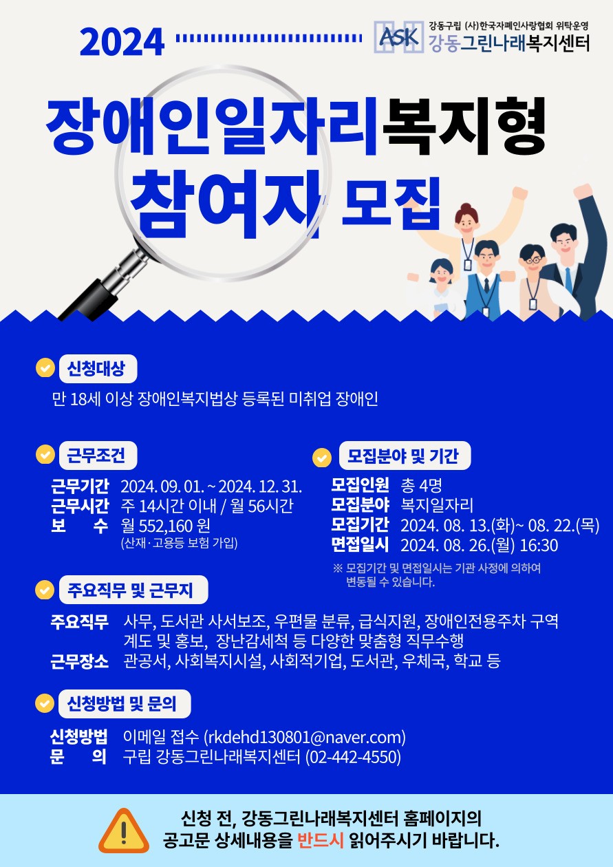 2024년 장애인일자리복지형 참여자 모집 / 강동그린나래복지센터
