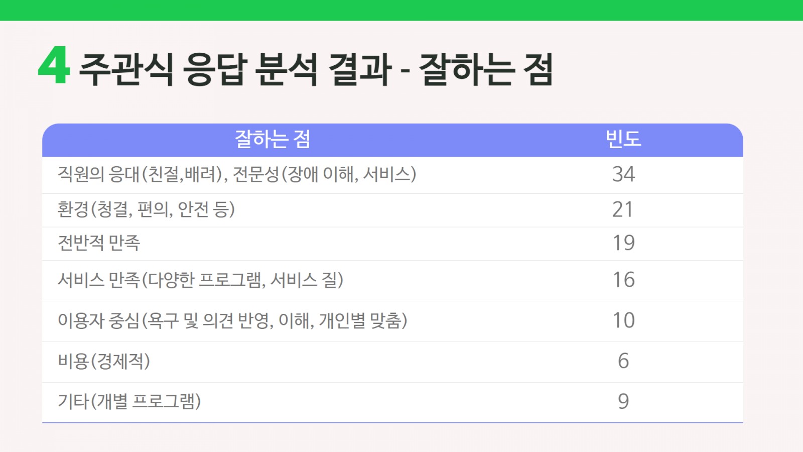 그 다음으로 복지관의 환경(청결, 편의, 안전 등)을 긍정적으로 평가해주신 분들도 많았으며, 우리 복지관에 대해 전반적으로 만족한다고 응답하신 분들도 많았습니다.