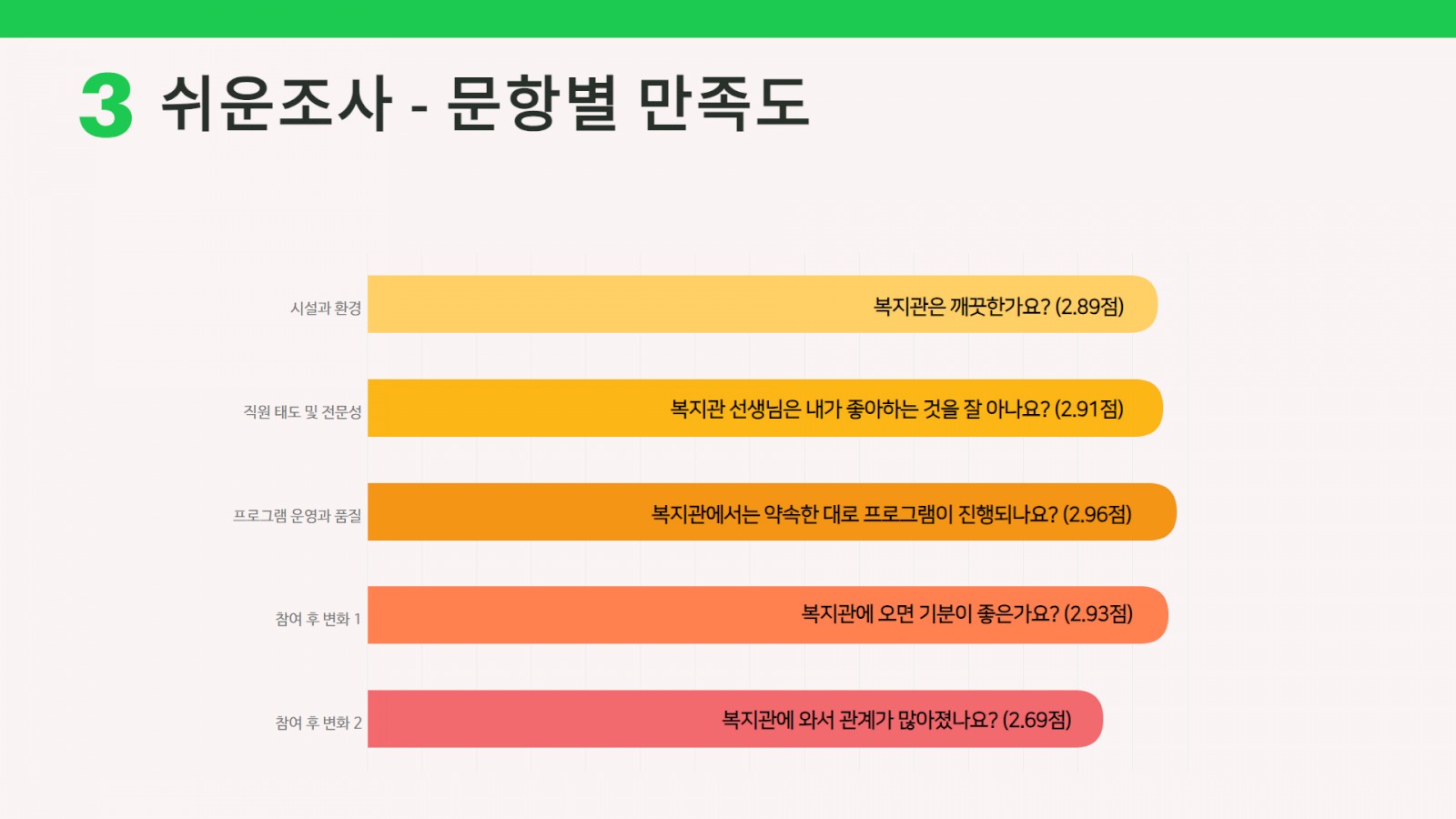 ‘복지관에 오면 기분이 좋아진다’는 문항의 점수 또한 매우 높게 나타났습니다.