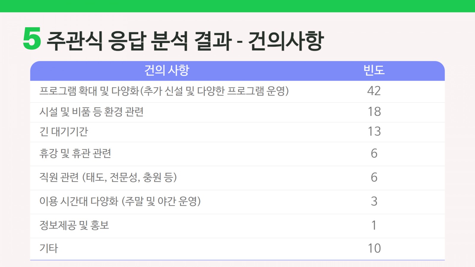 한편, “복지관이 보완하면 좋을 점”을 주제별로 분석한 결과, ‘프로그램 확대 및 다양화’를 요청하신 분들이 가장 많았습니다.