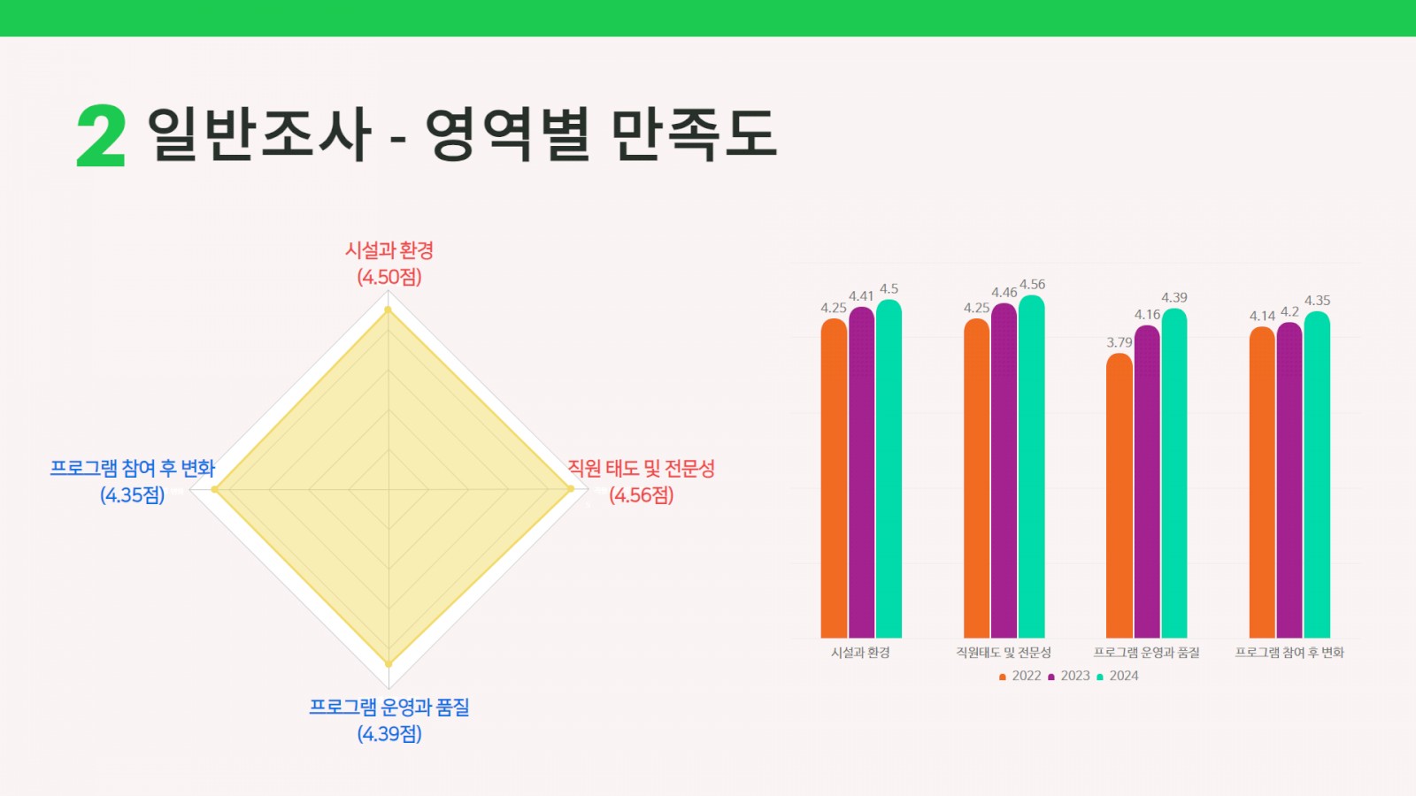 각 영역별로 살펴보면 ① 복지관의 시설과 환경 : 4.50점, ② 직원의 태도와 전문성 : 4.56점, ③ 프로그램 운영과 품질 : 4.39점, ④ 프로그램 참여 후 변화 : 4.35점으로