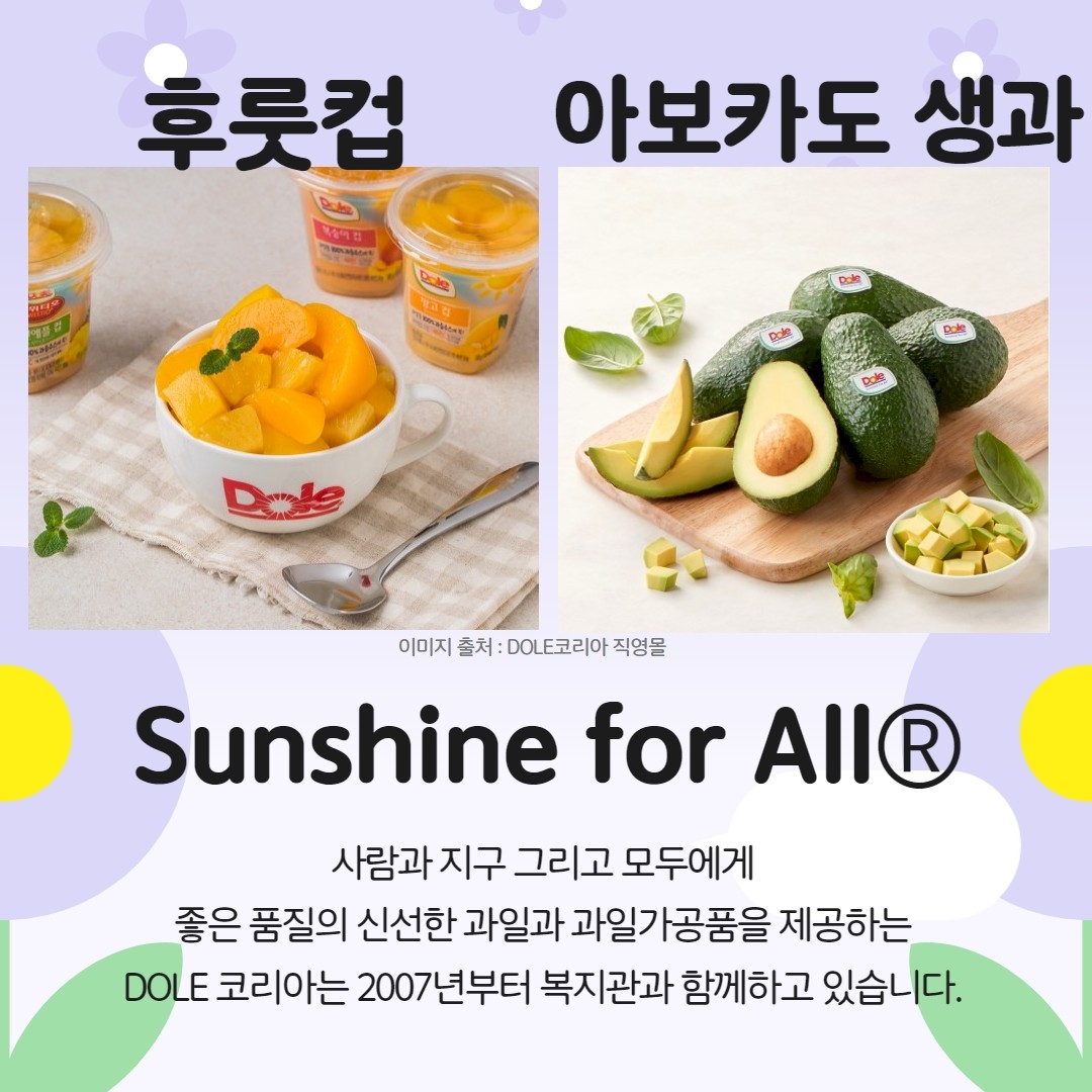 2007년부터 복지관과 함께하고 있는 "Sunshine for All®", DOLE(돌) 코리아는 사람과 지구, 그리고 모두에게 좋은 품질의 신선한 과일과 과일가공품을 제공합니다.