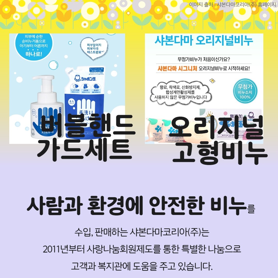 2011년부터 복지관과 함께하고 있는 샤본다마코리아(주)는 무첨가 비누로 사람과 환경에 안전한 비누를 수입, 판매하고 있습니다. 사랑나눔회원 특별나눔으로 고객과 복지관에 도움을 주고 있습니다.