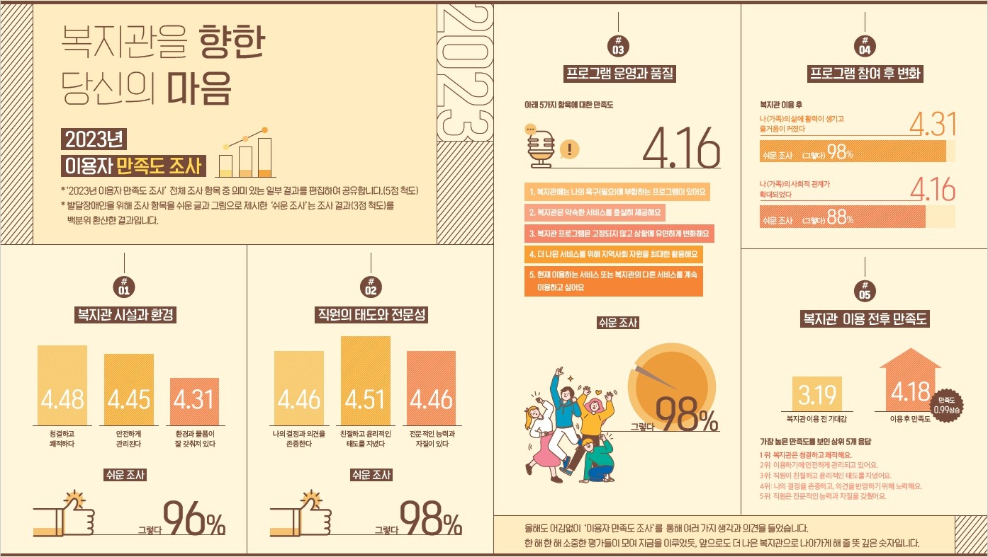 ▲소식지 '보통의 하루' 가을호(퍠vol.361)에서 '복지관을 향한 당신의 마음'이라는 칼럼을 통해 '2023년 이용자 만족도 조사' 전체 조사 항목 중 의미 있는 일부 결과를 알기 쉽게 편집하여 공유한 내용입니다. (이미지를 클릭하면 크게 볼 수 있습니다.)