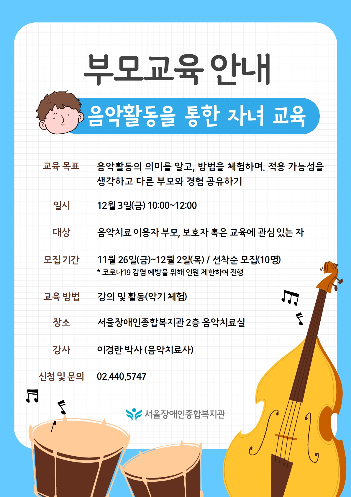 부모교육 안내: 음악활동을 통한 자녀교육 페이지 정보 작성자 서울장애인복지관 작성일21-11-26 08:58 조회수580 본문 교육 목표: 음악활동의 의미를 알고, 방법을 체험하며 적용 가능성을 생각하고 다른 부모와 경험 공유하기 일시 : 12월 3일(금) 10:00~12:00 대상 : 음악치료 프로그램 이용자 부모, 보호자 혹은 교육에 관심 있는 자 모집 기간 : 11월 26일(금)~12월 2일(목) / 선착순 모집(10명) * 코로나19 감염 예방을 위해 인원 제한하여 진행 교육 방법 : 강의 및 활동(악기 체험) 장소: 서울장애인종합복지관 2층 음악치료실 강사 : 이경란 박사(음악치료사) 신청 및 문의 : 02-440~5747 목록 이전글 2021년 11월 업무추진비 집행내역 공개 21.12.03 다음글 그동안 셔틀버스 이용해주신 분들께 감사드립니다. (2022년 1월 1일 셔틀버스 운행 폐지 안내) 21.11.23