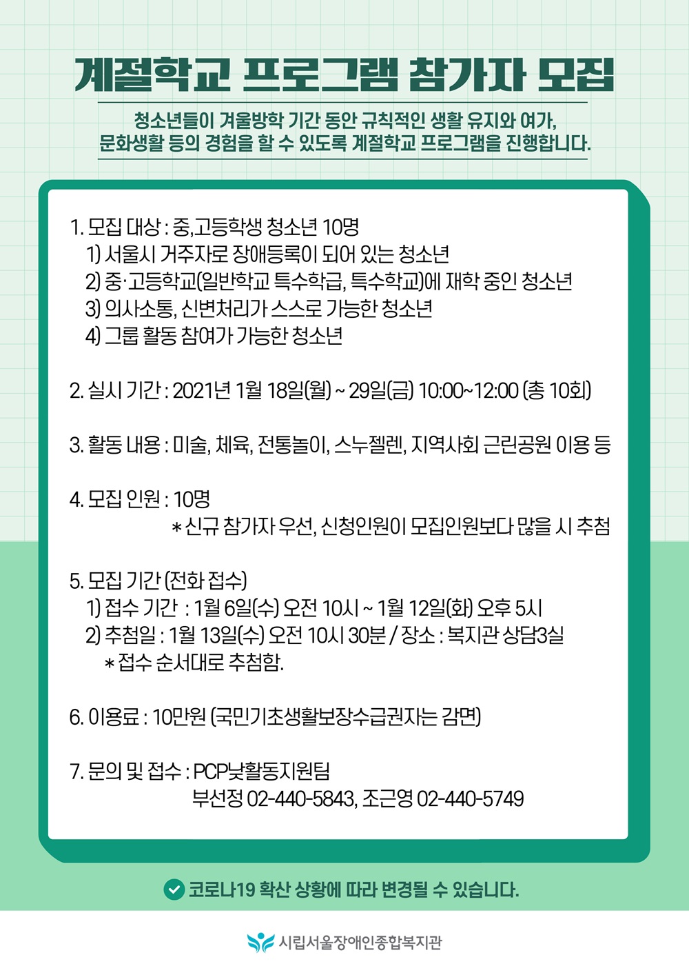 2021년 청소년(중고등학생) 겨울 계절학교 참가자 모집