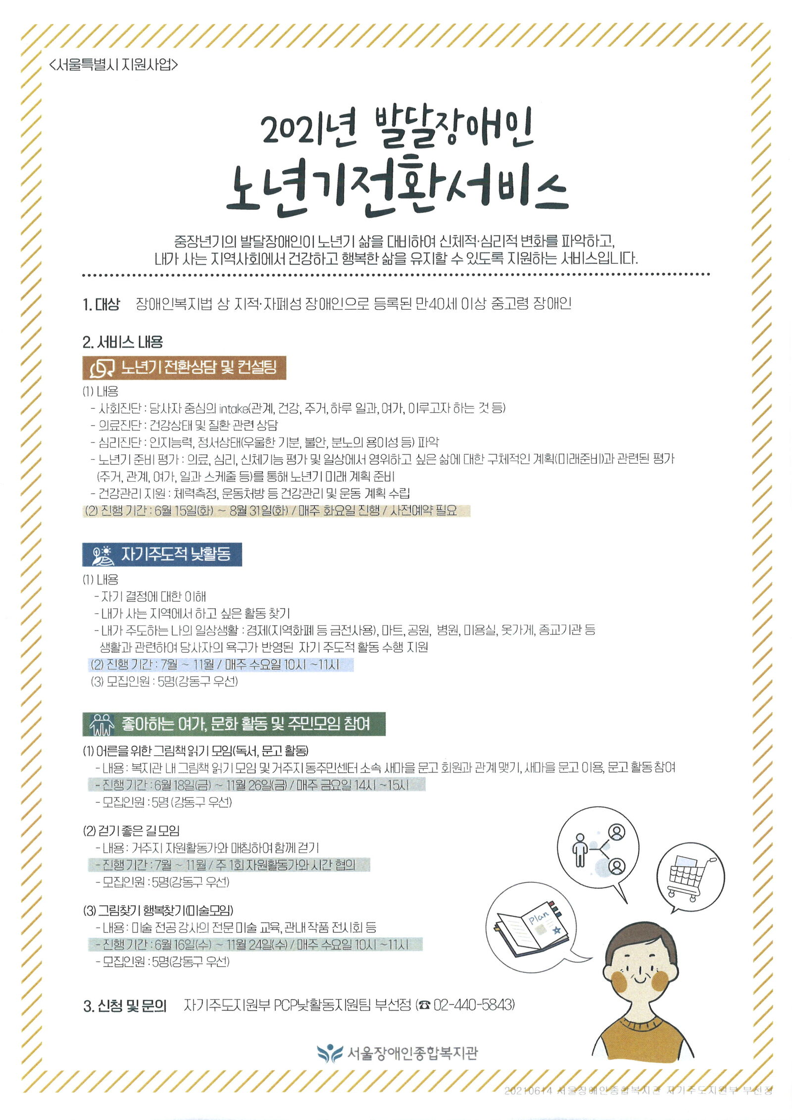 중장년기의 발달장애인이 노년기 삶을 대비하여 신체적, 심리적 변화를 파악하고 내가 살고 있는 지역사회에서 건강하고 행복한 삶을 유지할 수 있도록 지원하는 서비스입니다.