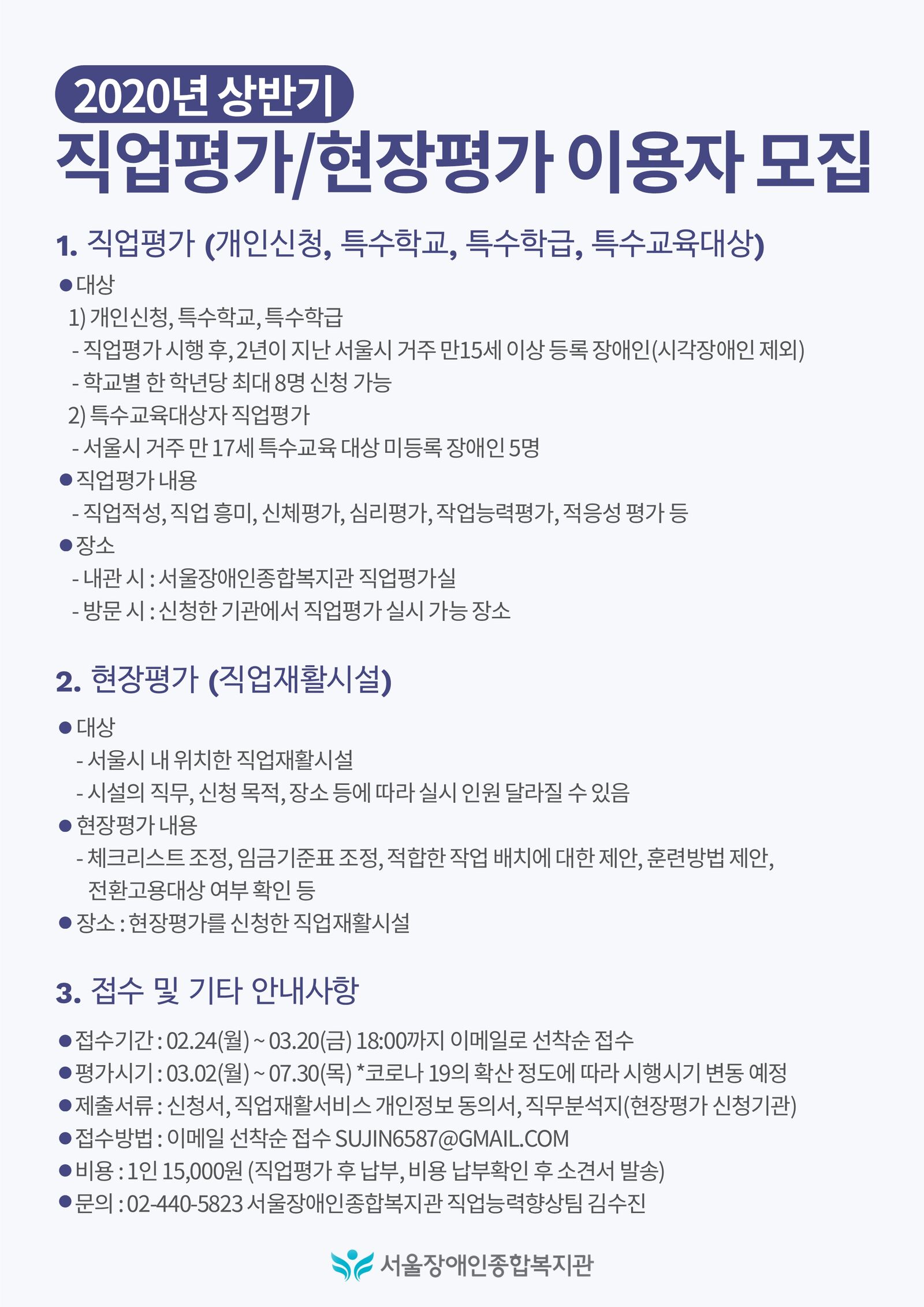 - 제출서류 : 신청서, 직업재활서비스 개인정보 동의서, 직무분석지(현장평가를 신청하는 직업재활시설)
