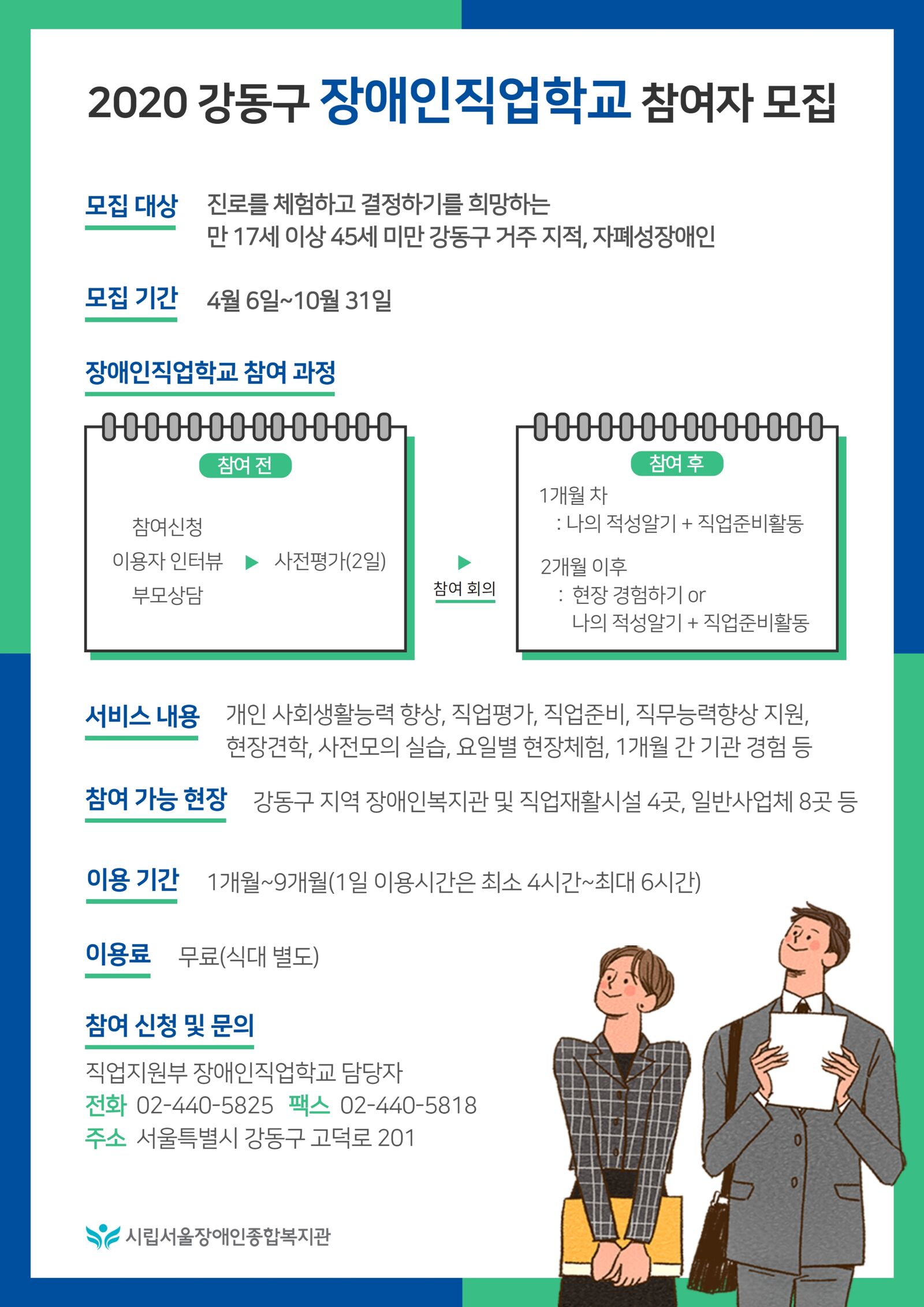 -참여 신청 및 문의 : 서울장애인종합복지관 직업지원부 장애인직업학교 담당자 (전화 : 02-440-5825, 팩스 : 02-440-5818)
