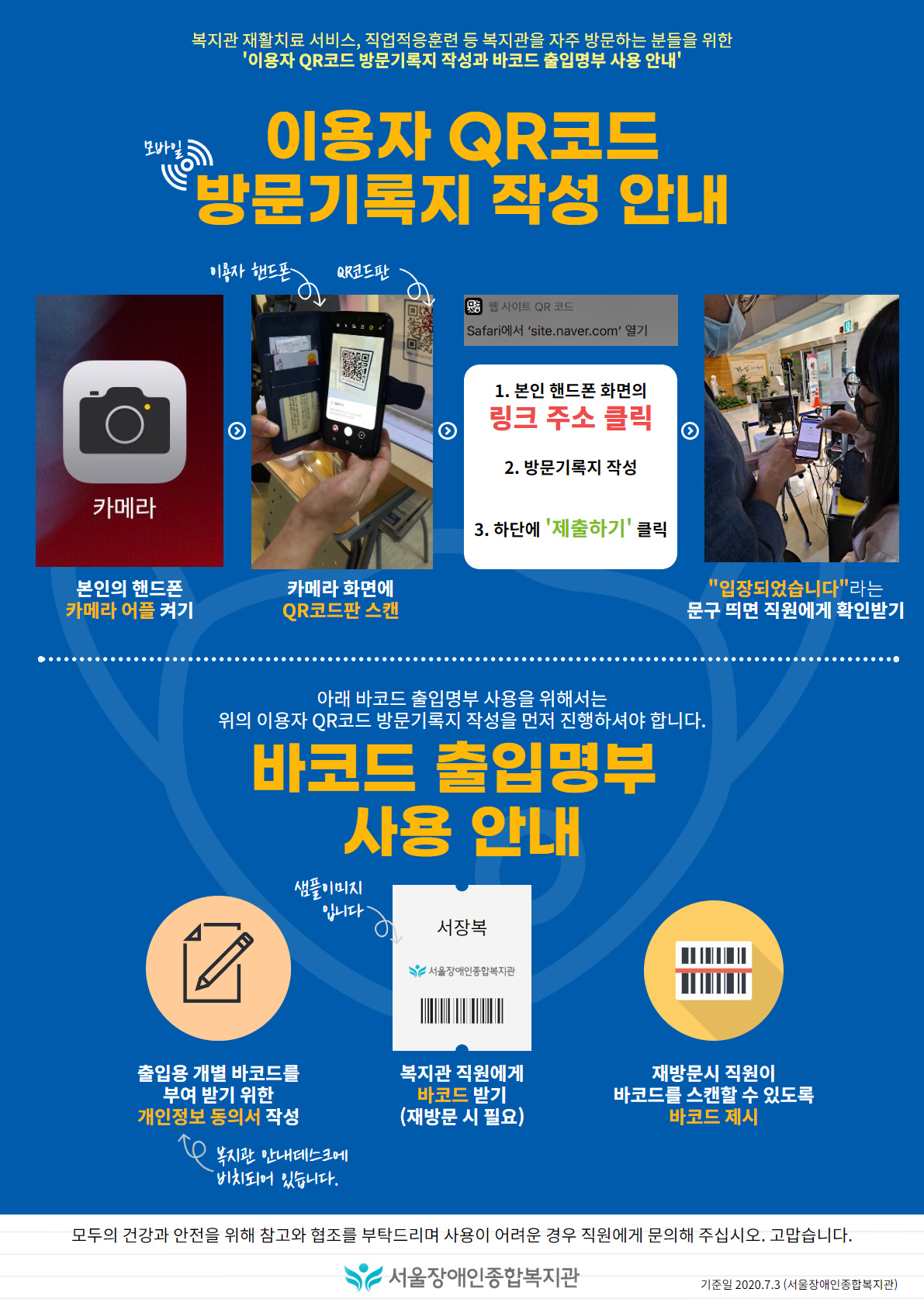 복지관 재활치료 서비스, 직업적응훈련 등 복지관을 자주 방문하는 분들을 위한 '이용자 QR코드 방문기록지 작성과 바코드 출입명부 사용 안내'