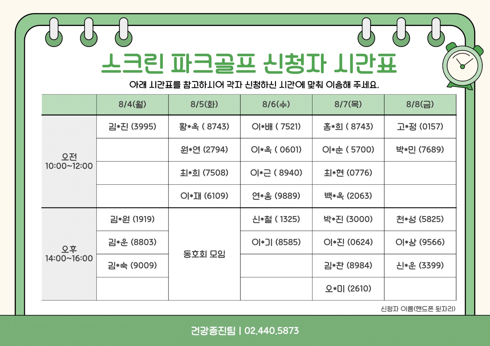 스크린 파크골프 시간표 안내 (8/4~8/8) 페이지 정보 작성자 서울장애인종합복지관 작성일25-08-01 17:23 조회수85 본문 안녕하세요 서울장애인종합복지관 건강증진팀입니다.아래와 같이 스크린 파크골프 시간표를 안내드립니다.신청하신 분들은 해당 시간에 맞춰 이용해 주세요.운영시간 : 오전 10:00~12:00 / 오후 14:00~16:00장소 : 서울장애인종합복지관 지하 1층 스크린 파크골프장문의 : 건강증진팀 장호경 02-440-5873 목록 이전글 스크린 파크골프 시간표 안내 (8/11~8/15) 25.08.08 다음글 2025년 7월 업무추진비 집행내역 공개 25.08.01