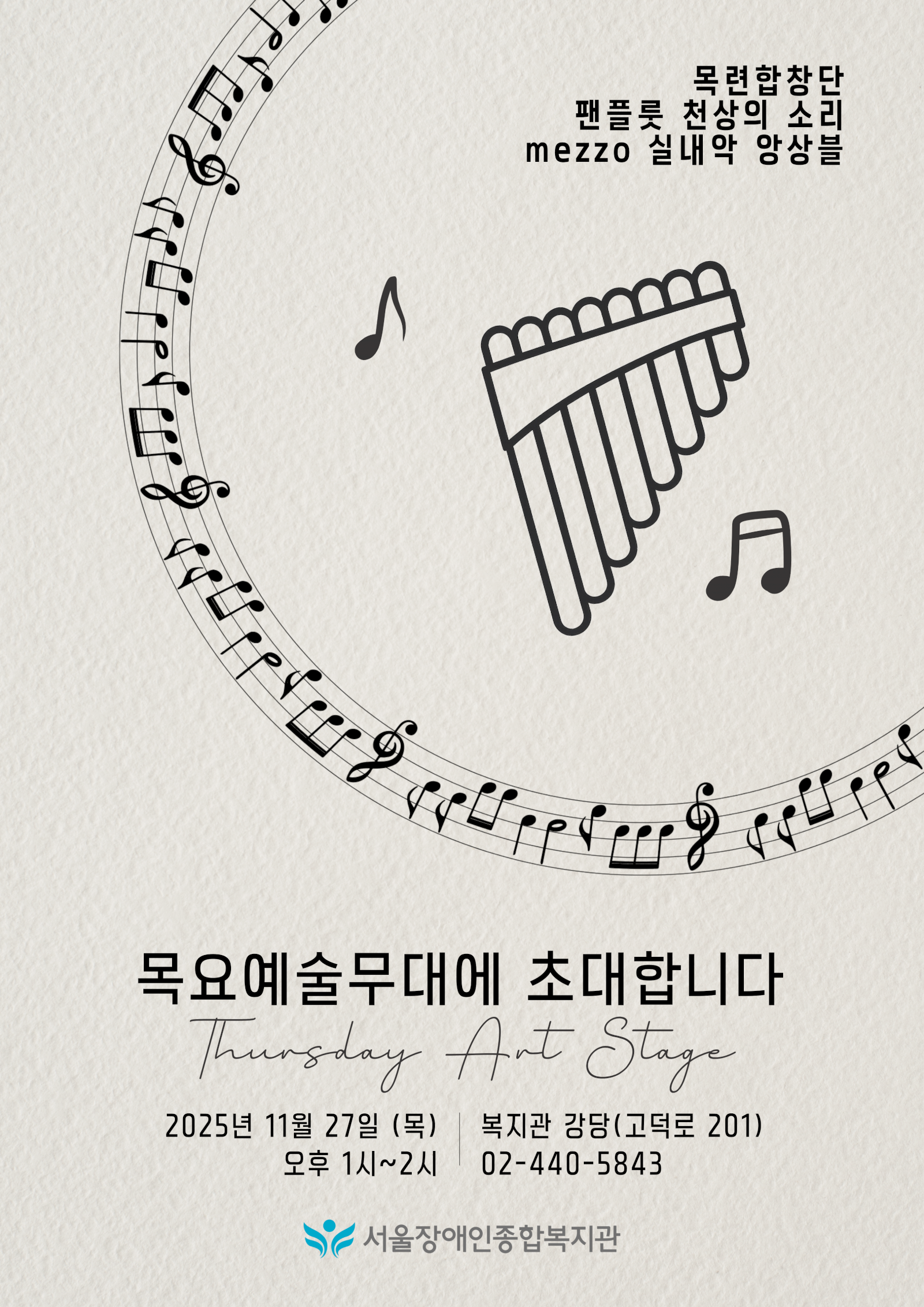 목요예술무대가 열립니다 페이지 정보 작성자 서울장애인종합복지관 작성일25-11-20 16:40 조회수131 본문 [ 목요예술무대 ]1. 일시 : 11월 27일(목), 오후 1시 ~ 2시2. 장소 : 강당3. 공연 : 목련합창단, 팬플룻 천상의소리, mezzo실내악 앙상블2025 가을도 점점 저물어가고 있습니다.단풍의 아름다움을 음악과 함께해 보심은 어떨까요? 목록 이전글 2026년 직원 및 이용자 급식용 식자재 납품업체 선정결과 안내 25.11.21 다음글 [상호나눔활동 -서로배움교실(조화공예) 참여자 모집] 25.11.20
