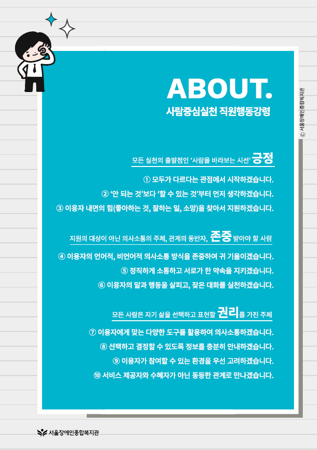 복지관은 긍정, 존중, 권리를 키워드로 한 사람중심실천 직원행동강령을 수립하고, 실천안내서를 마련하였습니다.