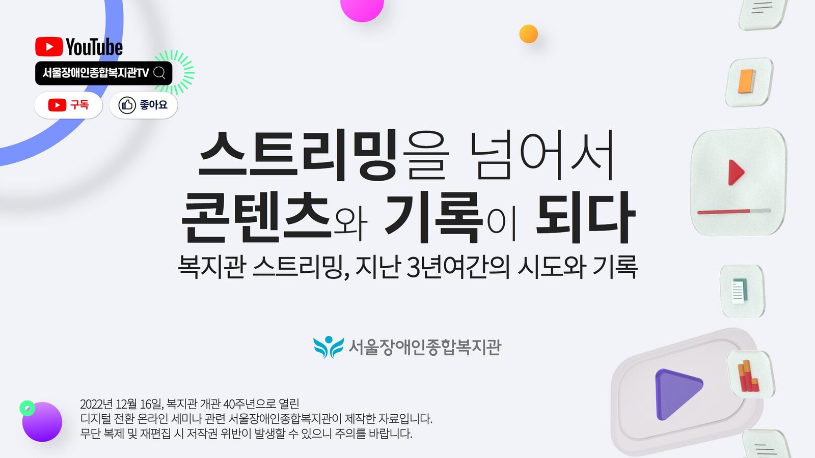 [사례발표]스트리밍을 넘어서 콘텐츠와 기록이 되다-서울장애인종합복지관 개관 40주년 디지털전환 온라인 세미나