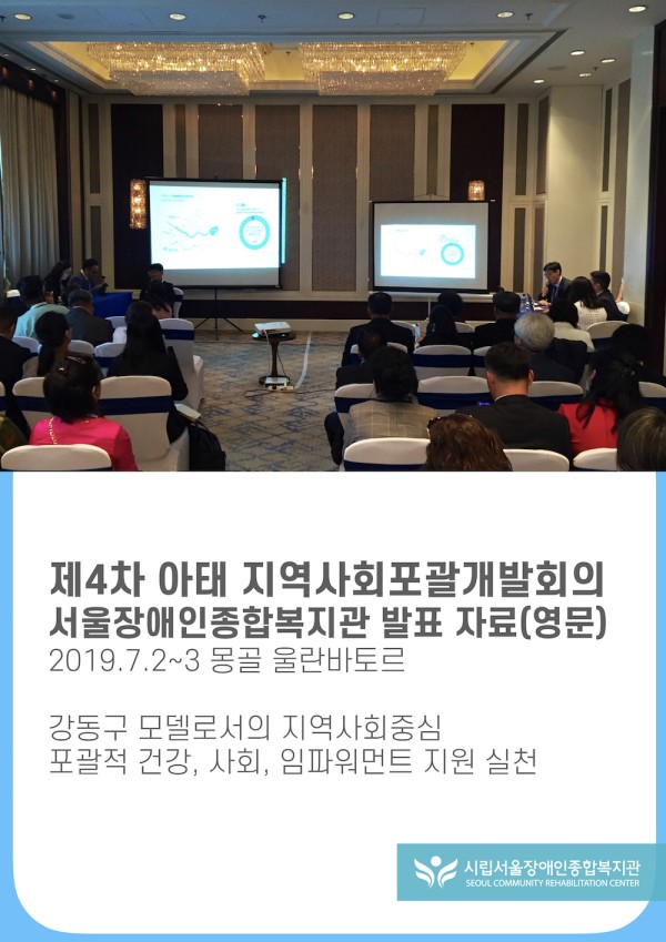 시립서울장애인종합복지관은 2019년 7월 2일(화)~3일(수)까지 몽골 울란바토르 상그릴리호텔에서 열린 '제4차 아시아-태평양 지역사회 포괄개발회의(지역사회기반 포용개발회의) / The 4th Asia-Pacific Community-Based Inclusive Development (CBID) Congress 2019'에 참석하여 7월 3일 '강동구 모델로서의 지역사회중심 포괄적 건강, 사회, 임파워먼트 지원 실천'을 제목으로 발표를 하였습니다.