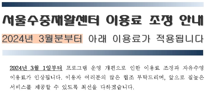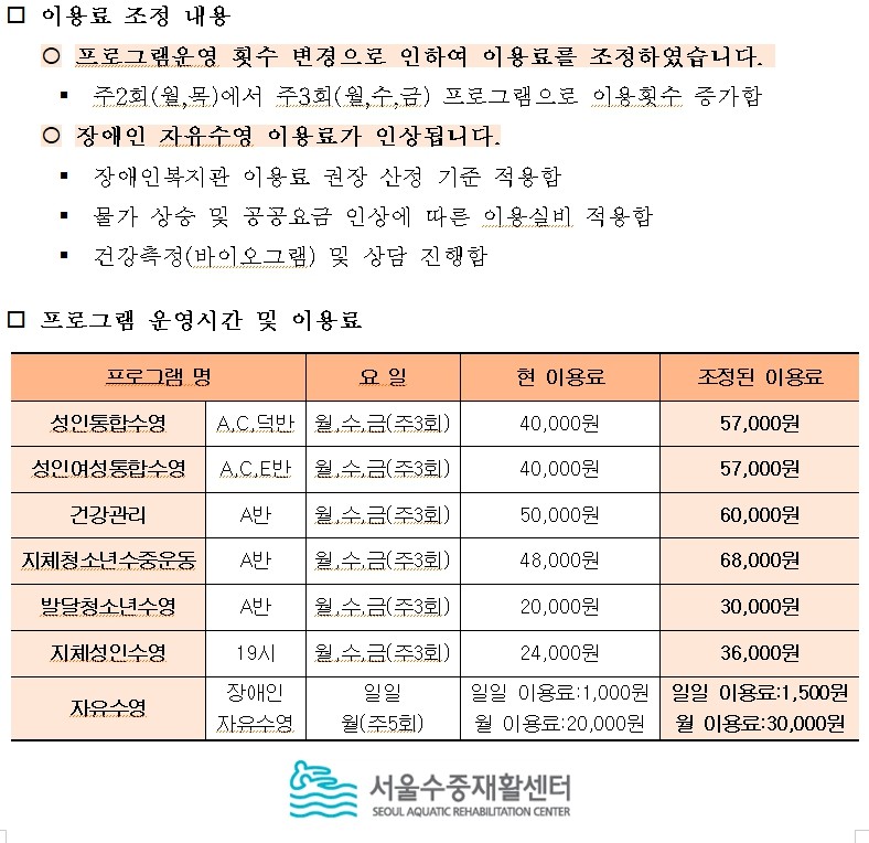 ★★★서울수중재활센터 프로그램 이용료 조정 안내 (2024년 3월 1일부터 적용)★★★ 페이지 정보 작성자 문주혜 작성일24-01-09 09:35 조회수702 본문 성인통합수영, 성인여성통합수영, 건강관리반지체청소년수중운동, 발달청소년수영, 지체성인수영, 자유수영24. 3월분부터 프로그램 이용료가 조정됩니다.오전 9시 - 9시 50분 / 오전 10시 - 10시 50분 / 오전 11시 - 11시 50분이용자분께서는 아래내용을 참고해 주시기 바랍니다. 목록 이전글 2024년 2월 휴관 안내입니다. 24.01.23 다음글 ★★★서울수중재활센터 저녁프로그램 운영 변경 안내 (2024년 3월 1일부터 적용)★★★ 24.01.09