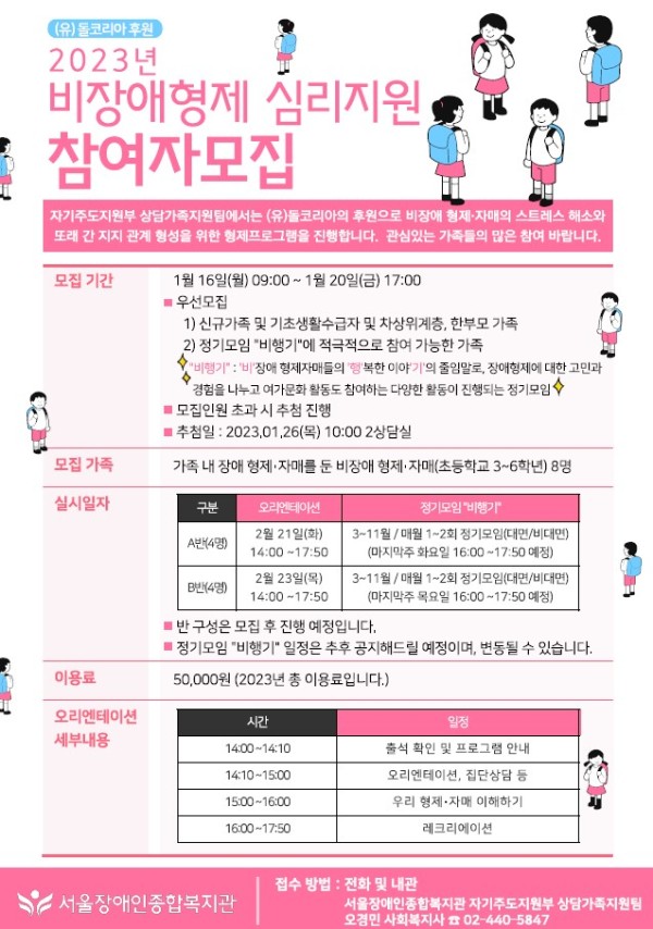 6. 접수방법 : 전화 및 내관 접수(서울장애인종합복지관 자기주도지원부 상담가족지원팀) / 02)440-5847 오경민 사회복지사