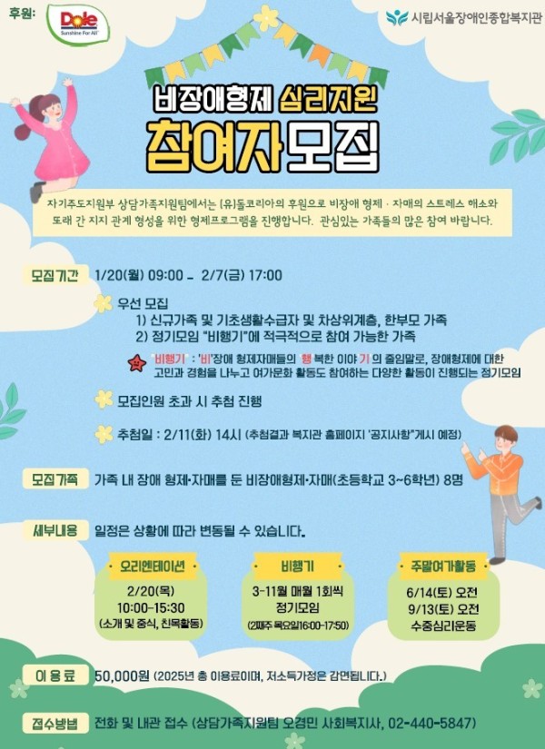 마감 2025년 비장애형제 심리지원 프로그램 참여자 모집(1/20~2/7)