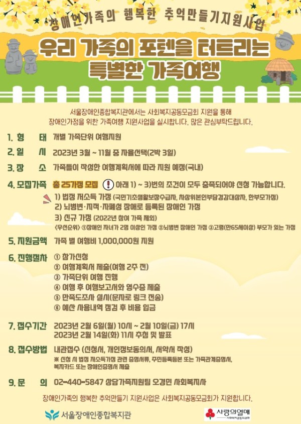 마감 "2023 장애인 가족의 행복한 추억만들기 지원사업" 참가자 모집(2/6-2/10) | 장애인 가족 여행 지…
