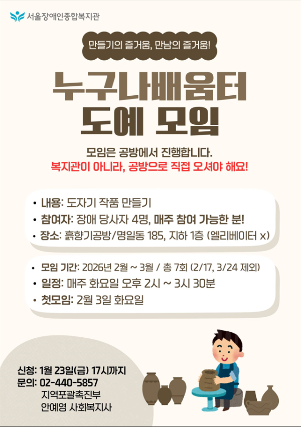 | 만들기의 즐거움, 만남의 즐거움! 누구나배움터 도예모임 모임은 공방에서 진행합니다. 복지관이 아니라, 공방으로 직접 오셔야 해요! -내용: 도자기 작품 만들기 -참여자: 장애 당사자 4명, 매주 참여 가능한 분! -장소: 흙향기공방 / 명일동 185, 지하 1층 (엘리베이터 X) -모임기간: 2026년 2월~3월 / 총 7회 (2월 17일, 3월 24일 제외) -일정: 매주 화요일 오후 2시~3시 30분 -첫모임: 2월 3일 화요일 -신청: 1월 23일(금) 17시까지 -문의: 02-440-5857 지역포괄촉진부 안예영 사회복지사 *모집인원 초과 시, 추첨 진행합니다 |