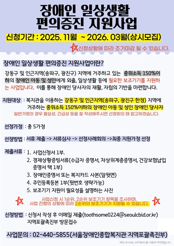 강동구 및 인근지역(송파구, 광진구) 지역에 거주하고 있는 중위소득 150%이하의 장애인 아동 및 성인에게 외출, 일상생활 등에 필요한 보조기기를 지원하는 사업입니다.
