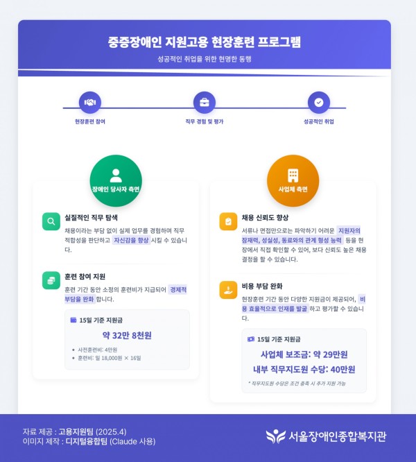 훈련은 서울장애인종합복지관과 같은 지원고용 위탁기관을 통해 참여할 수 있으며,