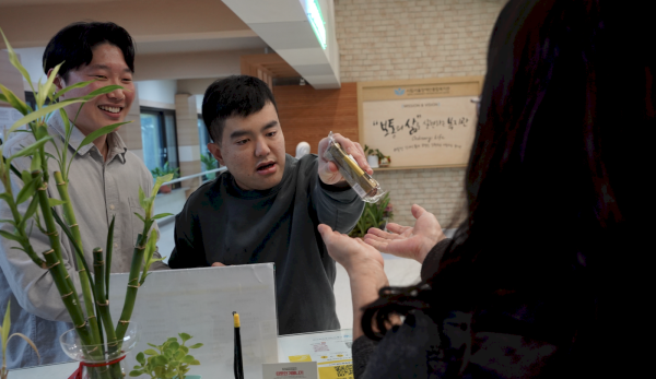 함께한 푸르메학교 지원자의 미소, 정성 담은 재원 씨의 눈빛, 깜짝 선물을 받은 복지관 직원의 따뜻한 감사의 메시지.