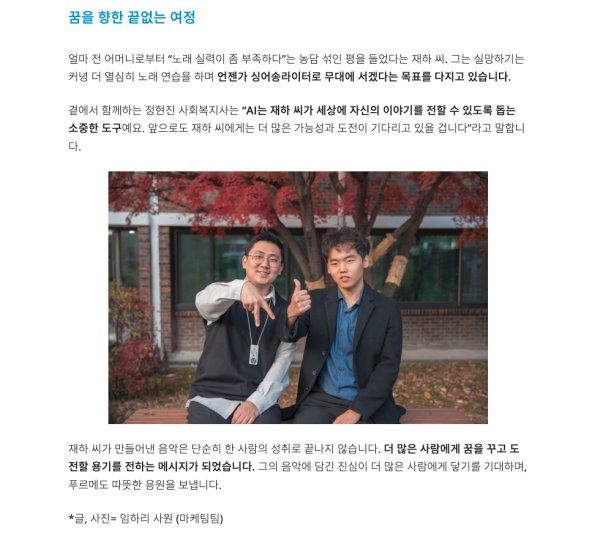 푸르메아카데미를 통해 처음 이재하 씨를 만난 정 사회복지사는 그의 음악적 열정을 발견하고, 디지털융합팀과 협력해 AI 활용 방안을 제안했습니다.